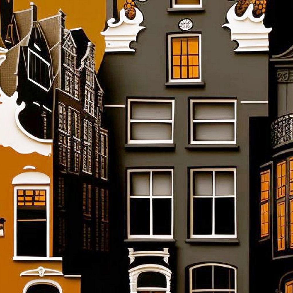 Das stilisierte und farblich kontrastreiche Kunstwerk präsentiert eine Reihe von traditionellen, schmalen Häusern mit verzierten Giebeln in einer urbanen Szene. Die Gebäude sind in warmen Orange- und kühlen Grau- bis Schwarztönen gehalten, akzentuiert durch weiße Fensterrahmen und architektonische Details. Die Beleuchtung deutet auf Abend oder Dämmerung hin, mit warmem Licht, das aus einigen Fenstern scheint. Die Komposition wirkt grafisch und charmant, mit einer reduzierten, aber erkennbaren Darstellung städtischer Architektur.