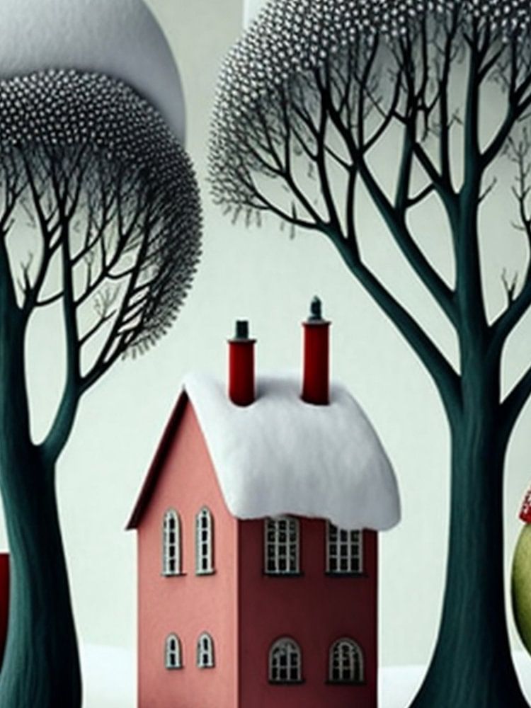 Die winterliche Szene präsentiert eine charmante, stilisierte Ansammlung von bunten Häusern in einer verschneiten Landschaft. Ein rotes Haus mit weißen Fensterrahmen und Schornsteinen dominiert das Zentrum, flankiert von einem kleineren, türkisgrünen Haus mit rotem Dach und einem ungewöhnlichen, birnenförmigen, grünen Haus mit rot-weiß gepunktetem Dach. Die Bäume sind von dicken Schneekuppen bedeckt, ihre dunklen Äste bilden einen malerischen Kontrast zum Weiß des Schnees und den farbigen Häusern. Die gesamte Komposition strahlt eine ruhige und märchenhafte Winterstimmung aus.