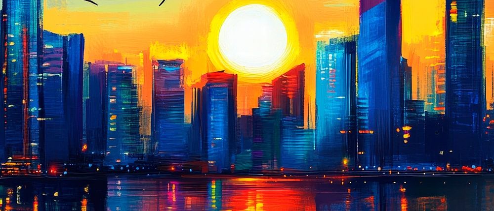 Mit strahlenden Sonnenstrahlen, die über die schimmernde Skyline brechen, entfaltet sich eine harmonische Verbindung zwischen Natur und urbanem Leben. Die kräftigen Farben und der friedliche Wasserspiegel laden dazu ein, in eine Welt voller Möglichkeiten einzutauchen. Dieses Kunstwerk verleiht jedem Wohnzimmer eine moderne, inspirierende Atmosphäre.