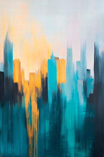 Ein dynamisches Farbspiel, das die Silhouetten einer modernen Stadt in sanften Grüntönen und leuchtendem Gelb erahnen lässt. Diese abstrakte Komposition strahlt Energie und Lebensfreude aus, perfekt geeignet für ein Wohnzimmer, wo sie als stilvoller Blickfang die Stimmung hebt und kreativen Gesprächsstoff liefert.