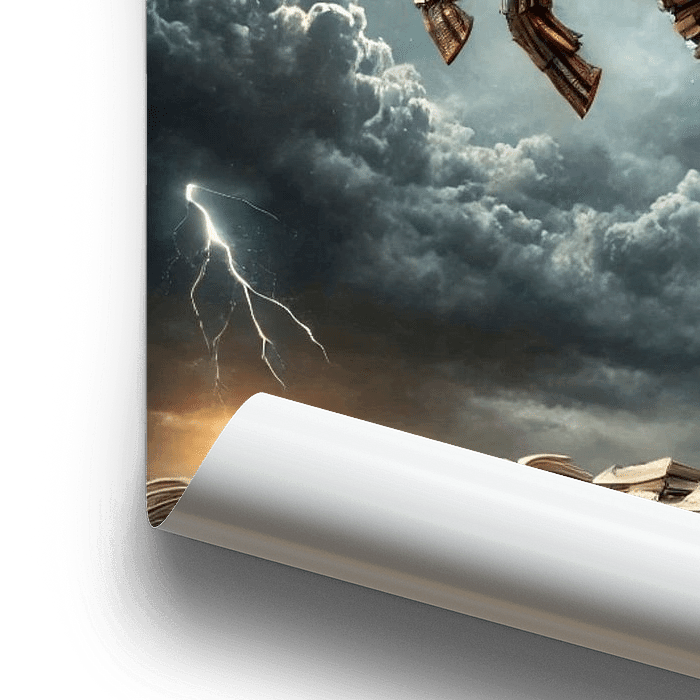 Dieses außergewöhnliche Poster zeigt ein faszinierendes, kraftvolles Pferd, das vollständig aus Büchern gestaltet ist. Das Pferd steigt majestätisch auf, während im Hintergrund dunkle Gewitterwolken und ein dramatischer Blitz die Szenerie eindrucksvoll beleuchten. Die wild wehende Mähne aus aufgeschlagenen Buchseiten symbolisiert Freiheit, Bewegung und den unaufhaltsamen Fluss von Wissen und Kreativität.