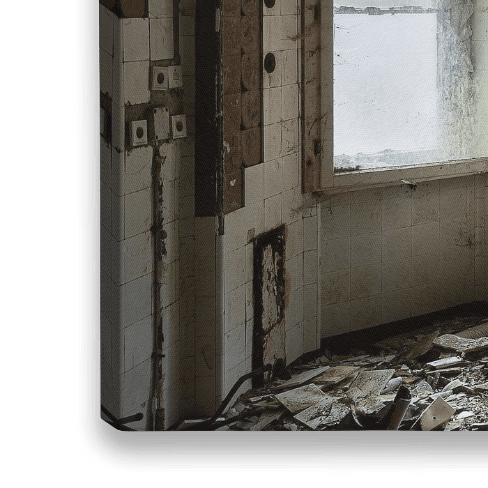 Dies ist ein Foto von einem relativ kleinen Raum im großen verlassenen Sanatorium Beelitz in Ostdeutschland. Trotz der Tatsache, dass ein Teil des Komplexes renoviert wurde, befinden sich andere Teile, wie dieser Teil, noch in einem Zustand der Verwahrlosung.
