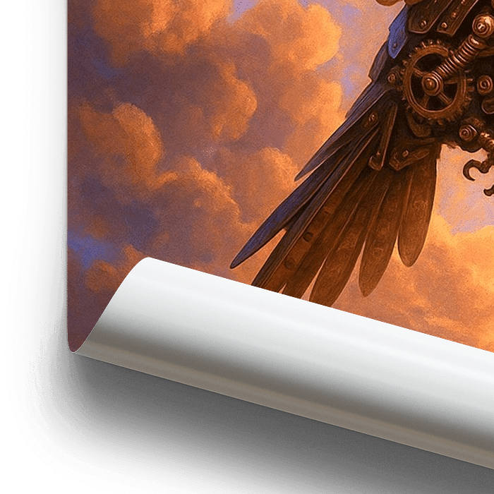Dieses außergewöhnliche digitale Poster zeigt einen majestätischen Kolibri, wie man ihn so noch nie gesehen hat: vollständig aus komplexen, glänzenden Steampunk-Elementen gefertigt. Zahnräder, Kupferplatten, feine Schrauben und filigrane Metallflügel verschmelzen zu einem kunstvollen, futuristisch-viktorianischen Wesen, das in warmes…