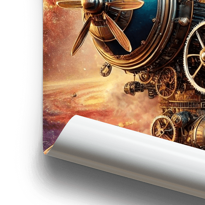 Dieses außergewöhnliche Poster entführt den Betrachter in eine Welt, in der Vergangenheit und Zukunft auf faszinierende Weise verschmelzen. Im Zentrum steht ein monumentales Steampunk-Raumschiff, detailreich ausgestattet mit Zahnrädern, Schornsteinen, Kuppeln und metallischen Strukturen. Während aus den Schloten Rauch aufsteigt, verleiht die Kulisse des leuchtenden Kosmos mit Planeten, Sternennebeln und fernen Galaxien dem Motiv eine beinahe grenzenlose Dimension.