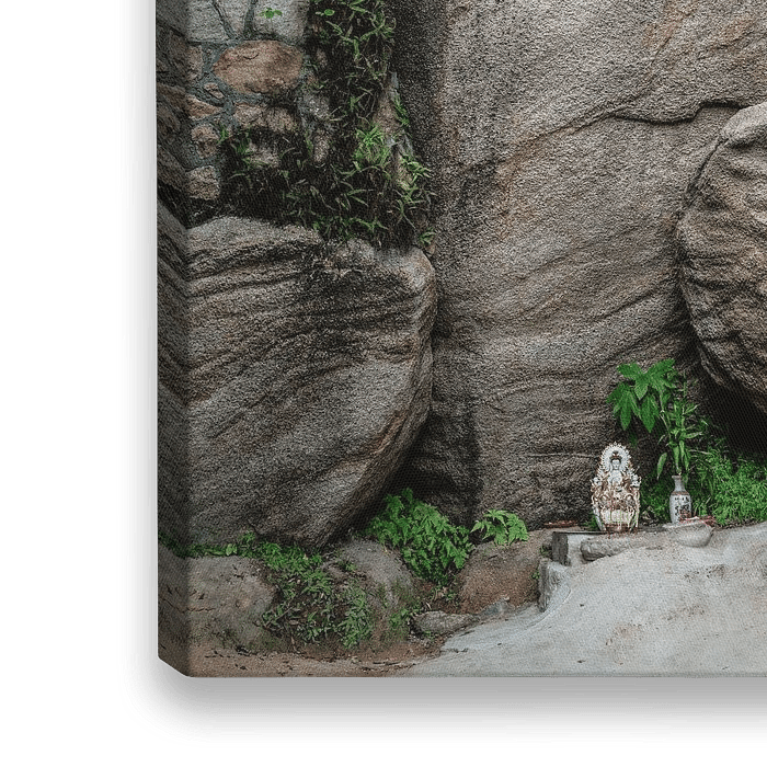 Großer grauer Stein mit rotem chinesischen Text und einem kleinen Buddha auf dem Boden davor in Macau, in der Nähe des A-ma-Tempels .
