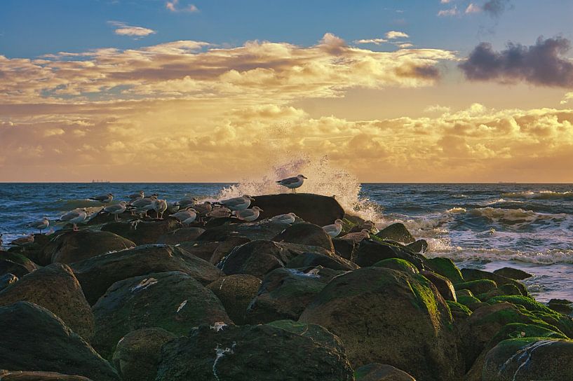 Steinbuhne am Meer zum Sonnenuntergang mit Möwe und spritzenden Wasser am Sandstrand in Dänemark. An der Küste Dänemark. Landschaftsaufnahme in Dänemark