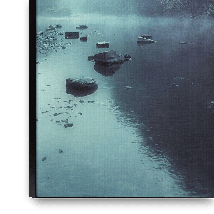 Bestelle dieses Landschafts-Wandbild Steine Im Fluss - Wupper an einem Nebelmorgen von Dirk Wüstenhagen als Reproduktion auf Leinwand, Alu-Dibond, als Poster, Fototapete oder Acrylglasbild.