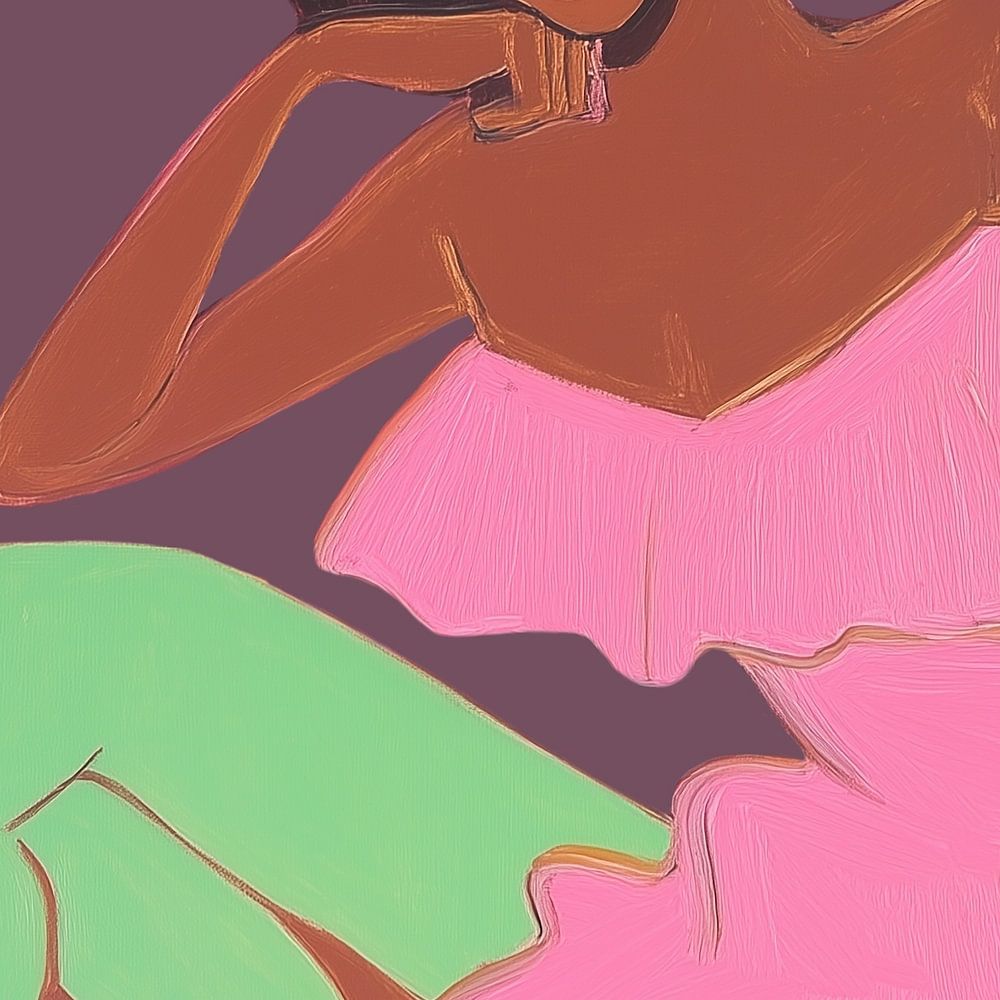 Auf diesem Gemälde wird eine Frau lebendig, die in einer entspannten, aber nachdenklichen Pose sitzt. Ihre Beine sind elegant übereinandergeschlagen, und ihre Hand stützt sich unter ihrem Kinn ab. Ihre Augen sind geschlossen, als befände sie sich in einem Moment der Introspektion oder der ruhigen Reflexion. Die weiche, verträumte Stimmung wird durch ihre minimalistische Pose und die Ruhe, die in ihrer Körpersprache zum Ausdruck kommt, noch verstärkt.