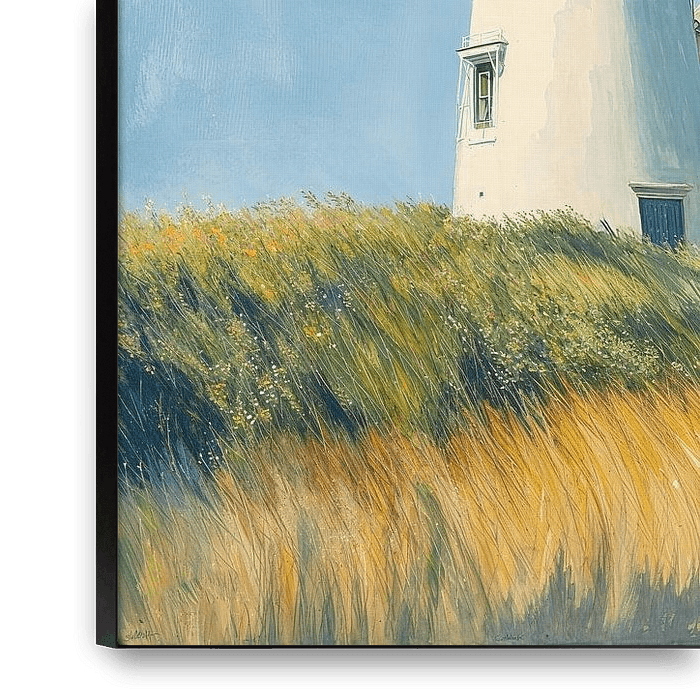 Das Gemälde zeigt einen majestätischen Leuchtturm, der stolz an einer rauen Küste thront. Umgeben von sanften Wellen und schroffen Felsen strahlt der Leuchtturm ein warmes, einladendes Licht aus, das den Betrachter in seinen Bann zieht. Die Farbpalette ist geprägt von sanften Blau- und Grautönen, die die melancholische Stimmung des…