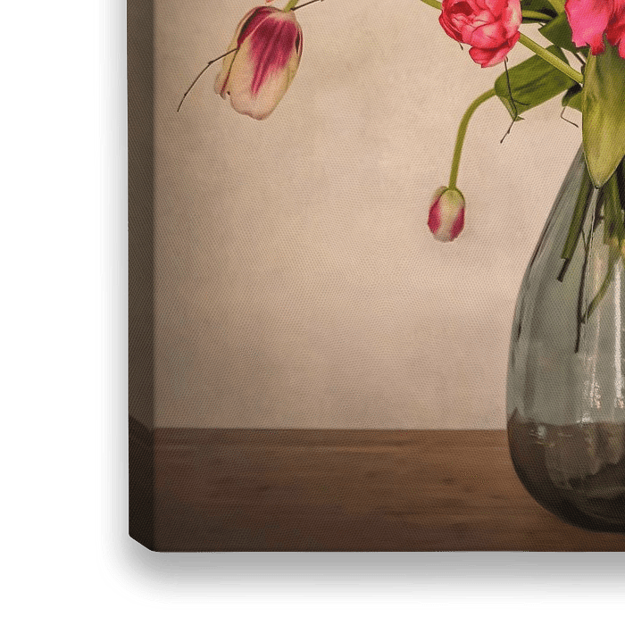 Modernes Stillleben von Tulpen mit Zweigen in einer Glasvase