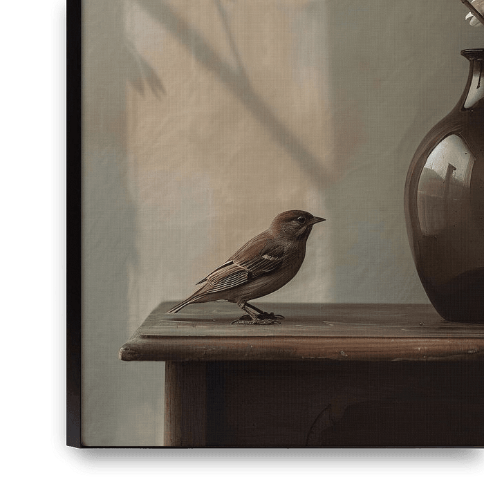Entdecken Sie den rustikalen Charme dieses sorgfältig komponierten Stilllebens, in dem die Zeit stehen geblieben zu sein scheint. Ein nachdenklicher Vogel ruht auf dem Rand einer alten, dunkelbraunen Vase, die mit den zartesten weißen Blütenzweigen gefüllt ist, die die Einfachheit und Reinheit der Natur ausstrahlen. Die warme…