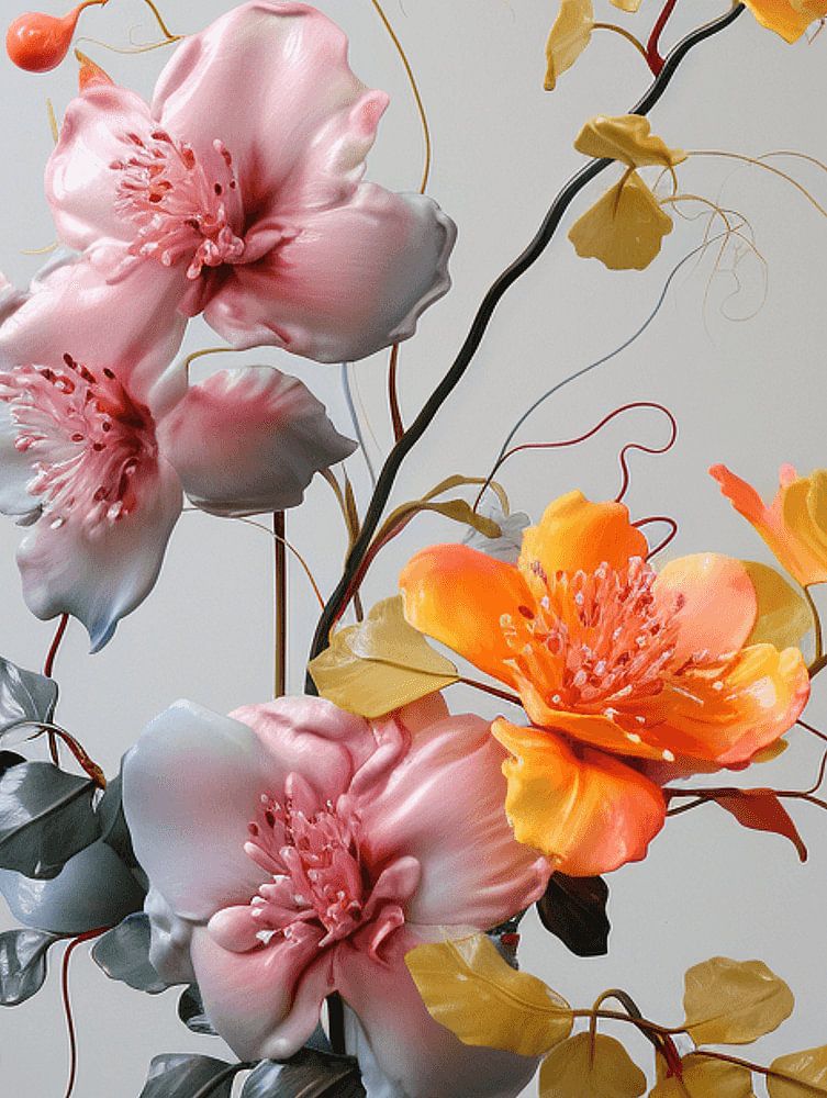 Dieses kunstvolle Bild zeigt eine elegante und fast surreal wirkende Blumenkomposition in einer zarten blauen Vase. Die Blüten in sanften Rosatönen und leuchtendem Orange scheinen fast aus Porzellan oder Glas geformt zu sein, was ihnen eine faszinierende, skulpturale Qualität verleiht. Feine, geschwungene Ranken und Blätter mit metallisch anmutenden Reflexen verleihen dem Arrangement eine organische, aber zugleich futuristische Ästhetik. Die harmonische Farbpalette und die filigrane Anordnung der Elemente erzeugen ein Gefühl von Leichtigkeit und Eleganz.