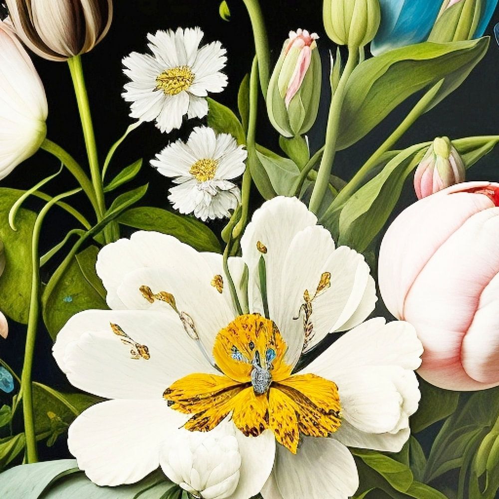 Ein prächtiges Stillleben mit einer üppigen Blumenkomposition in einer kunstvoll verzierten Vase entfaltet sich vor dunklem Hintergrund. Die leuchtenden Farben von Tulpen, Pfingstrosen, Gänseblümchen und Kornblumen kontrastieren mit dem tiefen Schwarz, wodurch die filigranen Details der Blütenblätter und Blätter noch stärker hervortreten. Schmetterlinge und eine Biene setzen zarte Akzente, während vereinzelte Blüten und Blätter scheinbar zufällig auf dem Tisch verstreut liegen und eine natürliche Ungezwungenheit in das harmonische Arrangement bringen. Die Darstellung erinnert an die großen Meister der barocken Stilllebenmalerei, eingefangen mit atemberaubender Detailtreue und einem Hauch von Vergänglichkeit.