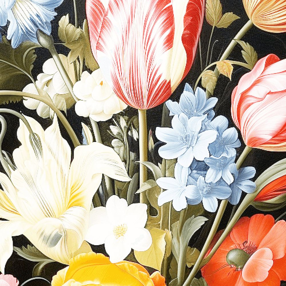 Ein prächtiges Stillleben mit einer üppigen Blumenkomposition in einer kunstvoll verzierten Vase entfaltet sich vor dunklem Hintergrund. Die leuchtenden Farben von Tulpen, Pfingstrosen, Gänseblümchen und Kornblumen kontrastieren mit dem tiefen Schwarz, wodurch die filigranen Details der Blütenblätter und Blätter noch stärker hervortreten. Schmetterlinge und eine Biene setzen zarte Akzente, während vereinzelte Blüten und Blätter scheinbar zufällig auf dem Tisch verstreut liegen und eine natürliche Ungezwungenheit in das harmonische Arrangement bringen. Die Darstellung erinnert an die großen Meister der barocken Stilllebenmalerei, eingefangen mit atemberaubender Detailtreue und einem Hauch von Vergänglichkeit.