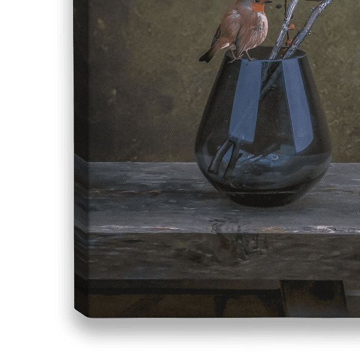 Foto einer Rauchglasvase auf einer Holzbank mit einem Zweig mit Beeren und einem Rotkehlchen auf dem Rand der Vase