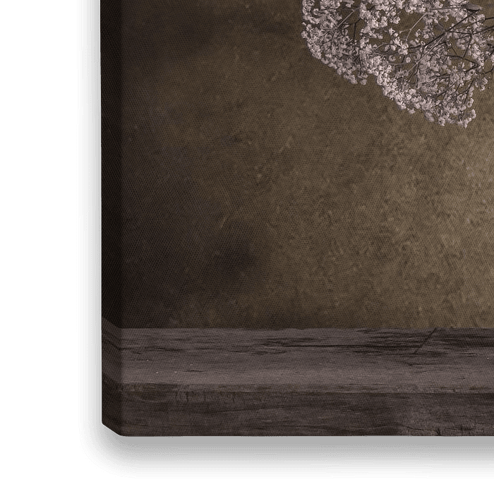 Bild einer Glasvase mit Schleierkraut und einem Haussperling.