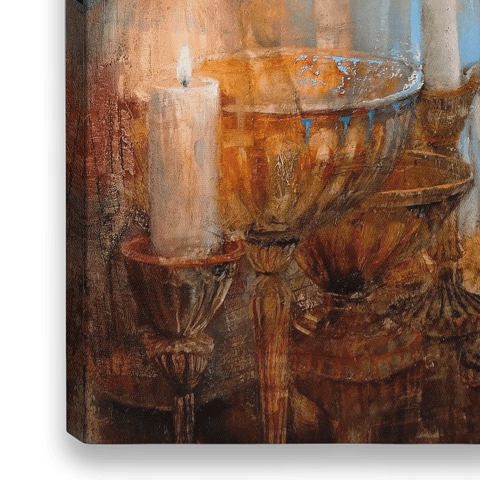 ein festlich erleuchteter Raum erstrahlt mit sieben Kerzen und taucht alles in geheimnisvolles goldenes Licht