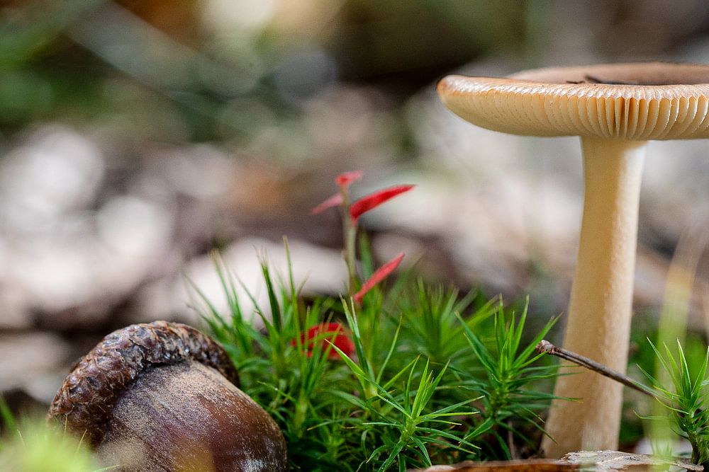 Schön beleuchteter Pilz in einem frischen und strahlenden Herbstwald. Bild mit Bokeh, Kontrasten und schöner Schärfe in einem niederländischen Wald im Herbst.