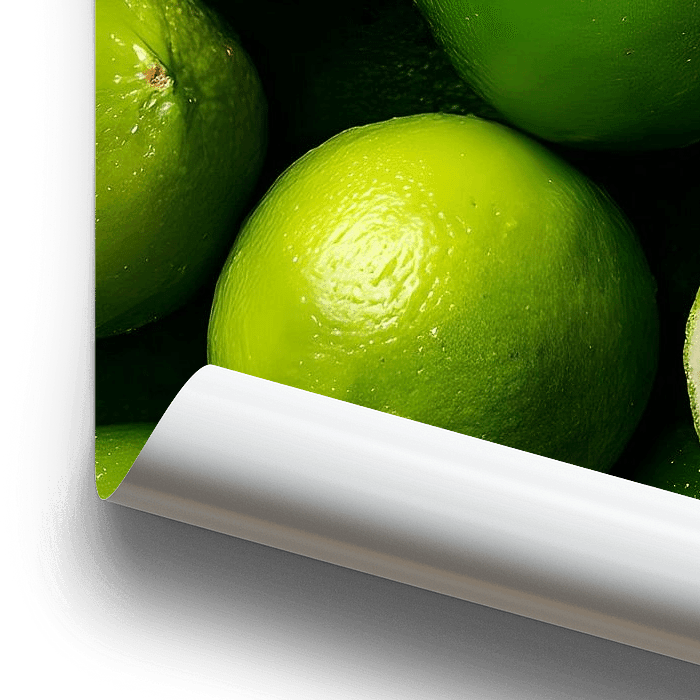 Dieses lebendige Food-Art-Motiv zeigt eine dichte, farbintensive Anordnung frischer Limetten – ganze Früchte und saftig aufgeschnittene Hälften, deren fein strukturierte Segmente im Licht schimmern. Das satte Grün wirkt erfrischend und energetisch, während die glänzenden Oberflächen und die natürlichen Poren der Schale dem Bild eine…