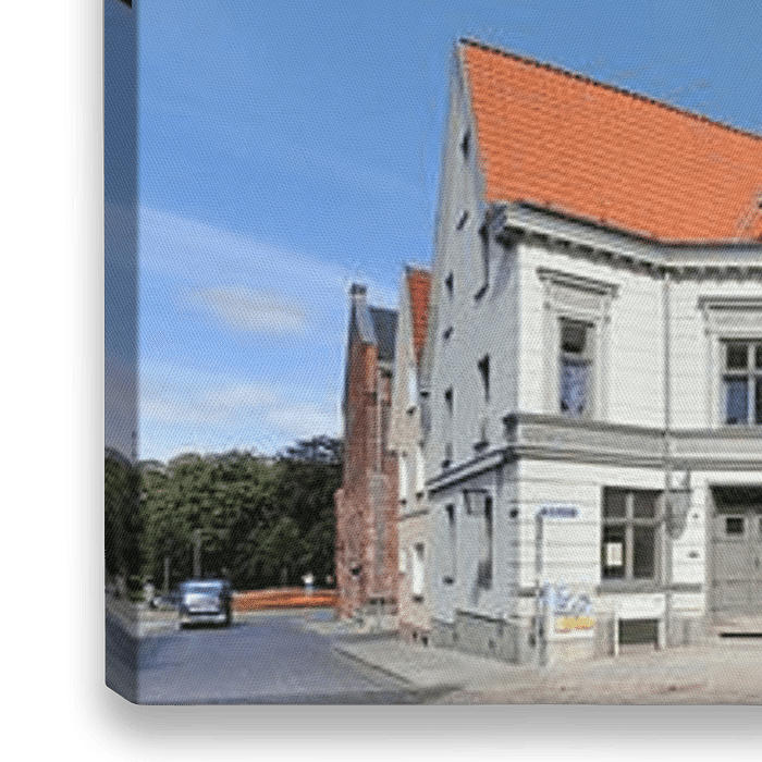 Bestelle das digitale Kunst Bild Stralsund | Alter Markt und Mühlenstrasse von Panorama Streetline als Reproduktion auf Leinwand, Alu-Dibond, als Poster, Fototapete oder Acrylglasbild.