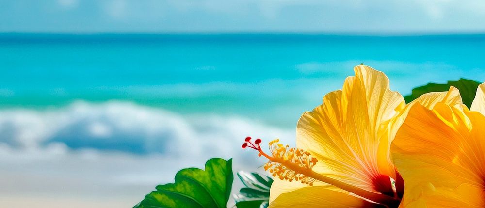 Die strahlend gelben Hibiskusblüten entfalten ihre Schönheit vor einem traumhaften, türkisfarbenen Meer. Das sanfte Rauschen der Wellen und der weiche Sand schaffen eine harmonische Atmosphäre. Dieses Bild bringt einen Hauch von Urlaub und Entspannung in jedes Wohnzimmer, ideal für eine Wandgestaltung, die zum Träumen einlädt.
