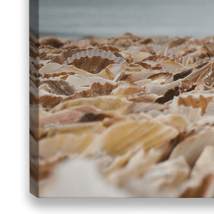 Rustikales Bild eines Strandes voller bunter Jakobsmuscheln, am Strand von Port-en-Bessin-Huppain, in der Normandie, Frankreich.