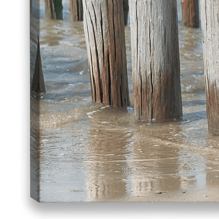 Nahaufnahme von Pfahlköpfen am Strand bei Domburg (Zeeland). Durch die Verwitterung durch die Sonne und das Salzwasser sind die Pfosten weiß geworden. Dies ergibt einen schönen Kontrast.