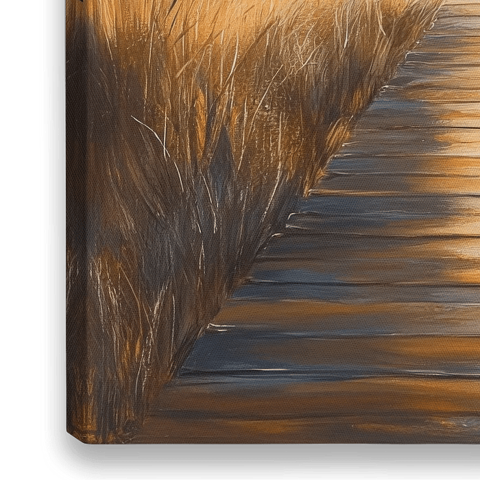 Sanfte Goldtöne und eine einladende Holzplanke führen durch das hohe, weiche Gras zum glitzernden Wasser des Meeres. Die Wolken am Himmel reflektieren das sanfte Licht des Sonnenaufgangs, während die ruhige Atmosphäre den Betrachter ins Träumen entführt. Ein Ort, an dem der Alltag verblasst und die Seele aufatmet.