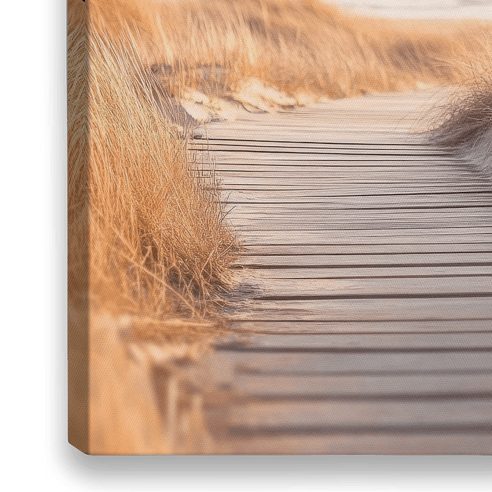 Ein sanfter Holzsteg schlängelt sich durch goldenes Grass, das im warmen Licht der Abendsonne leuchtet. Im Hintergrund glitzert das ruhige Wasser des Meeres, während der Himmel in zarten Pastelltönen erstrahlt. Es ist ein einladender Pfad, der zu friedlichen Momenten am Strand einlädt und die Seele entspannen lässt.