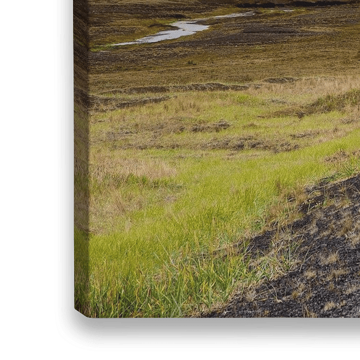 Die Straße windet sich durch eine wunderschöne Landschaft in Island. Die Bergspitzen sehen aus wie alte Vulkane.
