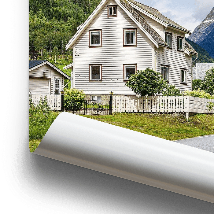 Bestelle dieses Landschafts-Wandbild Straße und Häuser in Fjærland in Norwegen von Rico Ködder als Reproduktion auf Leinwand, Alu-Dibond, als Poster, Fototapete oder Acrylglasbild.