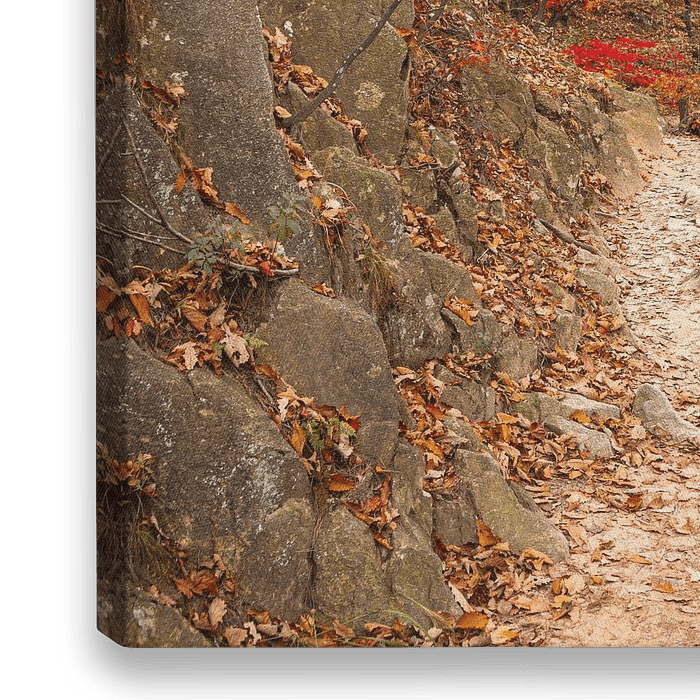 Weg zwischen den Bäumen und Felsen im Bukhansan-Nationalpark in Seoul, Südkorea. Im Herbst mit all den schönen roten und orangen Herbstfarben.