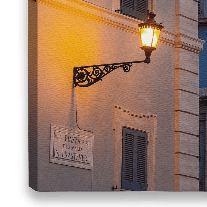 Straßenlaterne während der Nacht im Stadtteil Trastevere in der Stadt Rom, Italien. Oranges Licht auf dem Gebäude mit einem blauen Gebäude im Hintergrund.