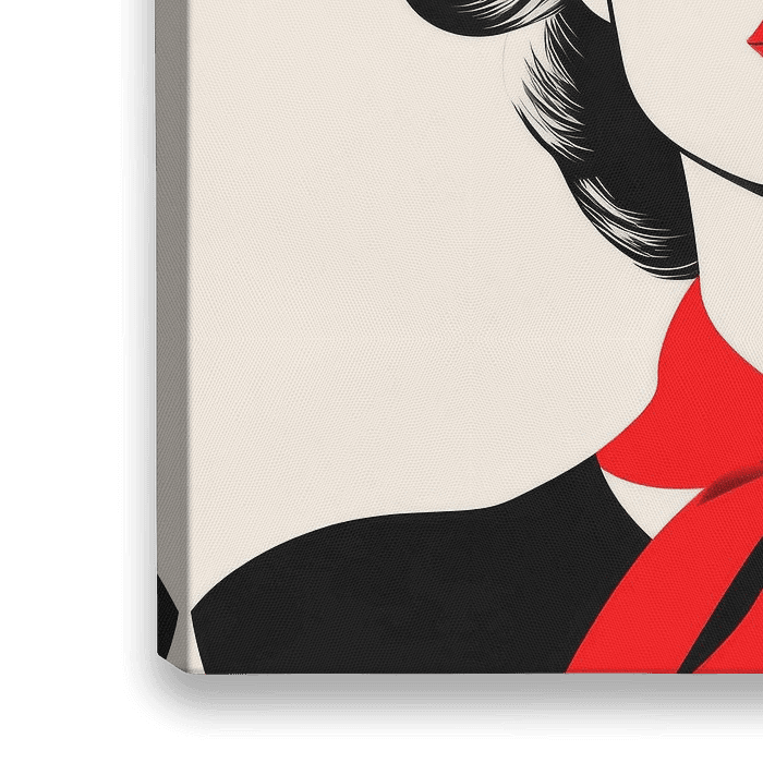 Das Bild zeigt eine stilisierte Frau mit auffälligen, großen Sonnenbrillen und kräftigen, roten Lippen. Ihr geheimnisvoller Ausdruck wird von einem leuchtend roten Schal unterstrichen, der um ihren Hals gebunden ist. Die klare Linienführung und der monochrome Hintergrund verstärken die zeitlose Eleganz und den glamourösen Charme der…
