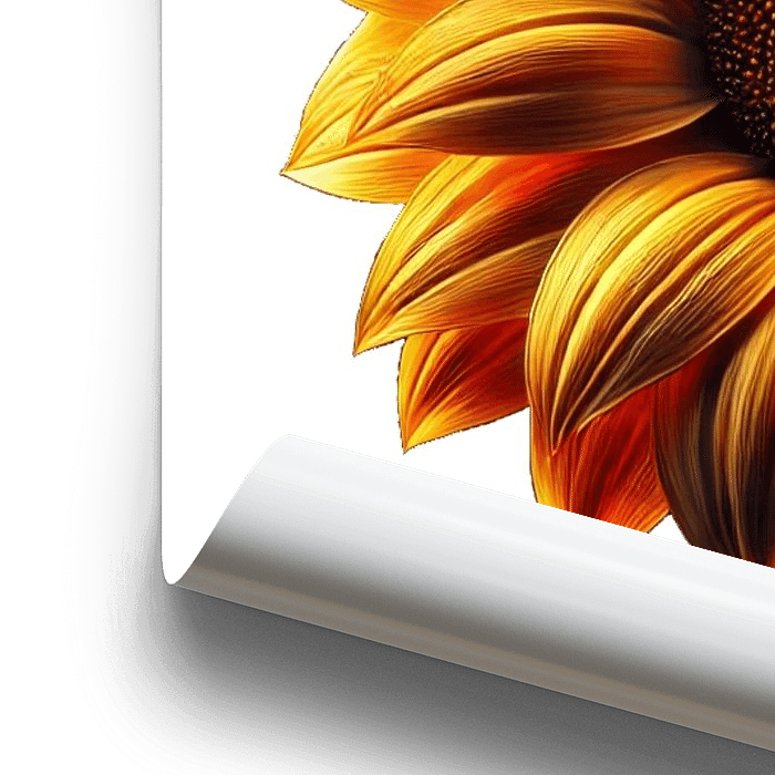 Das zentrale Motiv des Posters ist eine beeindruckend realistische Sonnenblume, deren goldgelbe Blütenblätter sich strahlenförmig vom dunklen, detaillierten Blütenkern ausbreiten. Der Kontrast zwischen den leuchtenden Farben und der strukturierten Mitte schafft ein intensives Spiel von Licht und Schatten, das die Schönheit der Natur in voller Pracht einfängt. Die filigranen Details der einzelnen Blütenblätter lassen den Betrachter die Textur und Struktur der Pflanze beinahe fühlen.