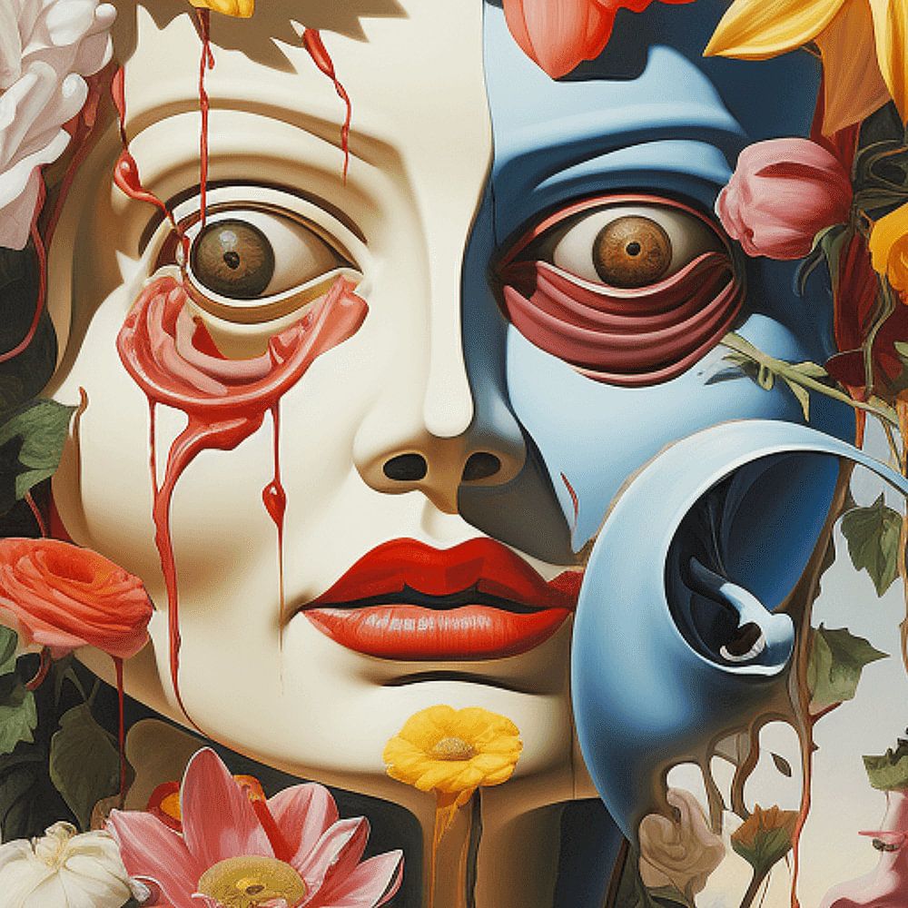 Dieses surrealistische Kunstwerk zeigt eine traumartige Landschaft unter einem weiten, blauen Himmel. Riesige, stilisierte Gesichter, die an Puppen oder Masken erinnern, schweben über einer kargen Küstenlandschaft. Die zentrale, weibliche Figur ist mit einer opulenten, weißen Blüte als Kopfschmuck versehen, deren orangefarbenes Herz an eine Sonne erinnert. Kleinere Gesichter und weitere Blüten wachsen auf dünnen Stängeln aus dem Boden, während winzige Insekten die Szene bevölkern. Die Komposition strahlt eine melancholische und zugleich faszinierende Atmosphäre aus, die das Menschliche mit dem Botanischen auf unerwartete Weise verbindet.