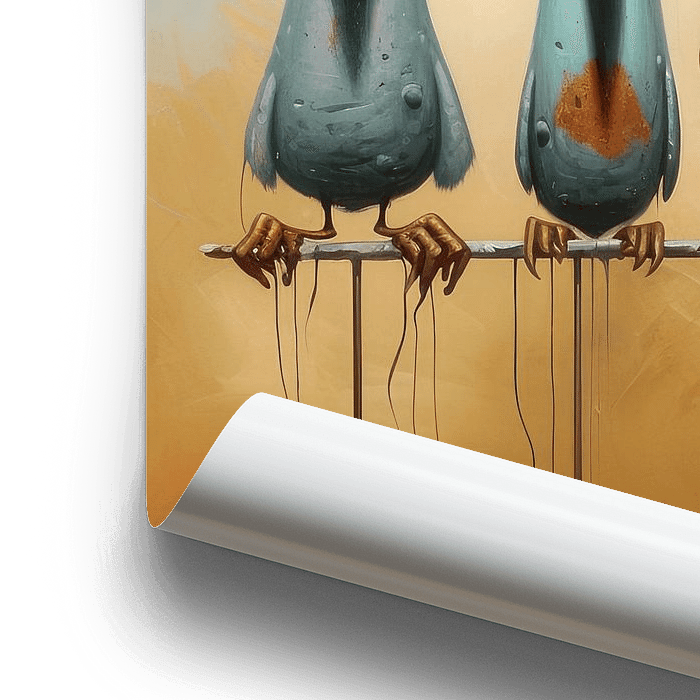 Dieses skurrile Bild zeigt eine Reihe von fünf anthropomorphen Vögeln, die auf einer Stange sitzen. Jeder Vogel hat eine ausgeprägte Persönlichkeit, dargestellt durch seine Form und seinen Gesichtsausdruck: von grimmig und skeptisch bis hin zu verängstigt und amüsiert. Ihre Gesichter sind karikaturartig übertrieben, und ihre Körper sind…