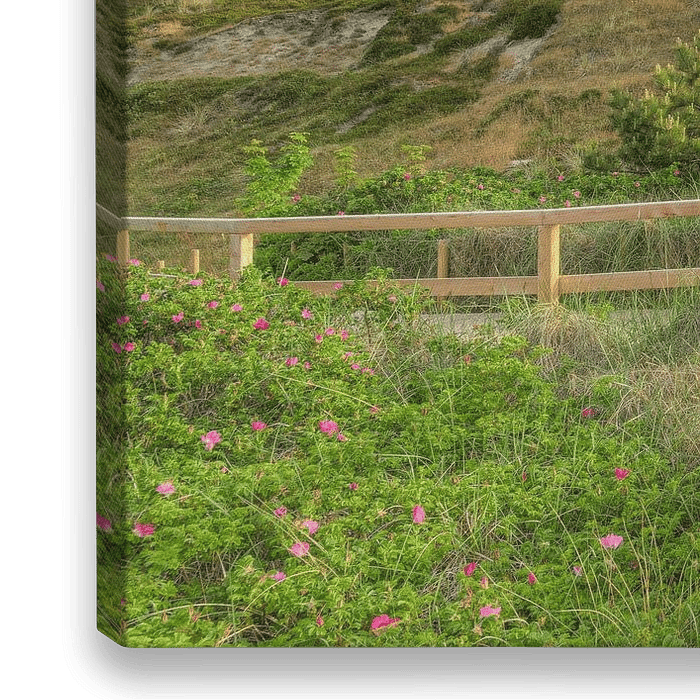 Morgens in Hörnum auf Sylt, Blick von einem Holzsteg in Richtung Leuchtturm links und Nordseestrand auf der rechten Seite.