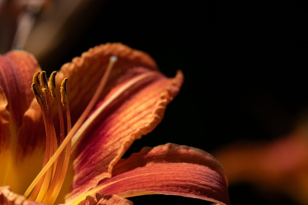 Nahaufnahme einer orangefarbenen Taglilie vor dunklem Hintergrund