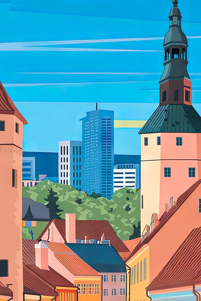 Between historic towers with charming spires, a vibrant street winds through Tallinn, blending old-world charm with modernity. Warmer Tönungen der Gebäude kontrastieren mit dem klaren Himmel, während die pulsierende Stadt gleichzeitig Geschichte und Fortschritt verkörpert. Hier trifft der Zauber der Vergangenheit auf die Energie der Gegenwart in einem faszinierenden Zusammenspiel.