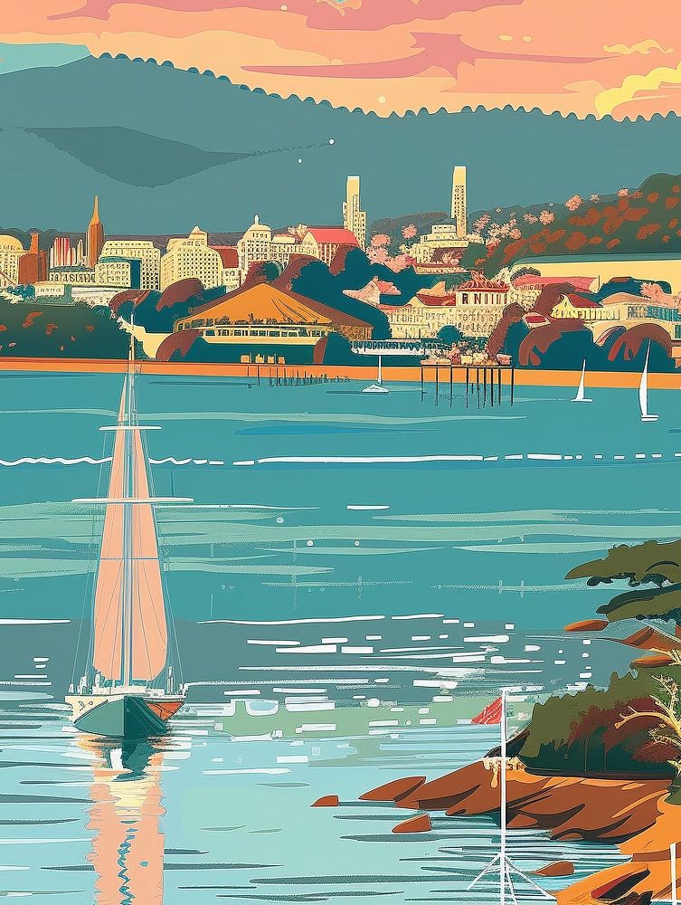 Tauchen Sie Ihr Dekor in die Naturwunder und die entspannte Atmosphäre der südlichen Insel Australiens mit diesem lebhaften Tasmanien-Reiseposter ein. Das Kunstwerk porträtiert meisterhaft malerische Hafenszenen, ruhige Segelboote, die über sonnenbeschienene Gewässer gleiten, und die üppigen, bewaldeten Hügel, die Tasmanien zu einem gefeierten Ziel für Naturliebhaber und Entdecker machen. Die bezaubernde Architektur der Stadt schmiegt sich in die Landschaft ein, unter einem Himmel mit sanften Pastellwolken, die an friedliche Sonnenuntergänge und kühle Meeresbrisen erinnern. Dieses retro-inspirierte Design vereint Abenteuer, Ruhe und australisches Erbe und ist eine hervorragende Ergänzung für jedes Wohnzimmer, Arbeitszimmer oder jeden kreativen Arbeitsbereich. Dieses von Reisenden, Künstlern und Liebhabern landschaftlicher Schönheit bewunderte Tasmanien-Poster bringt den Geist der Erkundung des Meeres und unvergesslicher Inselabenteuer in den Alltag. Feiern Sie friedliche Tage an der Bucht und die Großartigkeit der tasmanischen Landschaften mit einem Werk, das Sie dazu einlädt, zu entfliehen, Kraft zu tanken und sich auf eine Reise durch eine der einzigartigsten und beliebtesten Regionen Australiens zu begeben.
