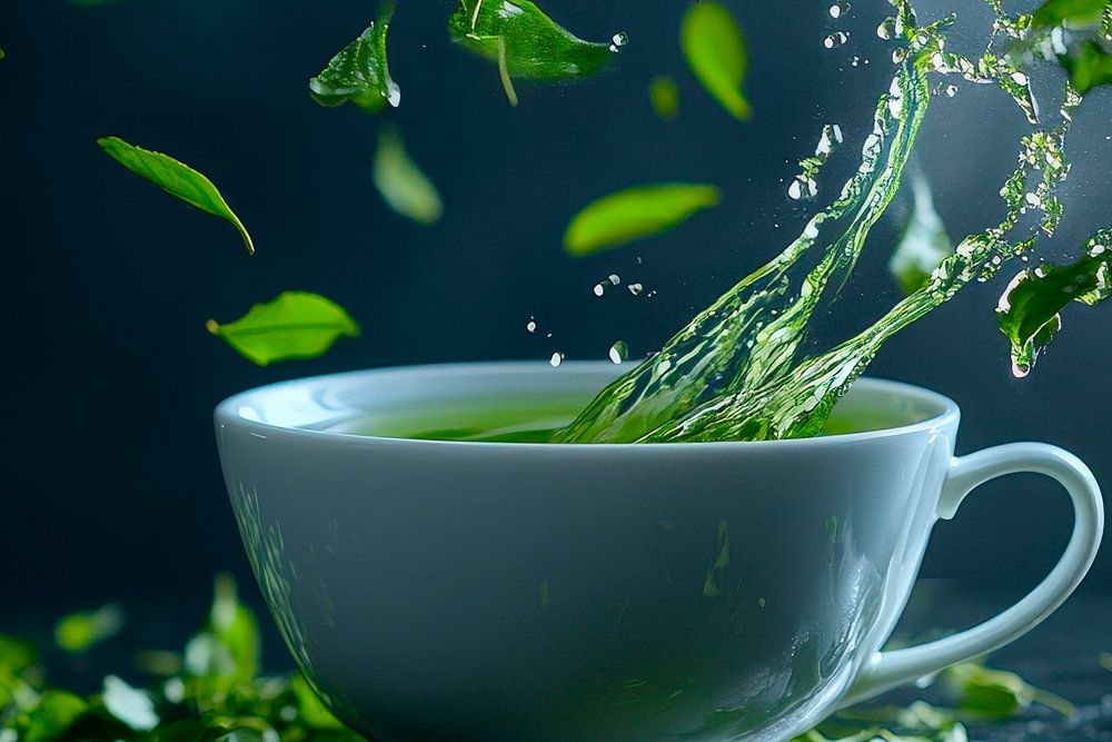 Ein harmonisches Spiel aus frischen, grünen Blättern und dampfender Vitalität entfaltet sich in dieser Komposition. Die beeindruckende Bewegung der Zutaten verleiht der Szene eine lebendige Energie. Ideal fügt sich dieses Kunstwerk in die Küche ein, wo es den Genuss von Kräutertee und gesunder Küche perfekt unterstreicht.