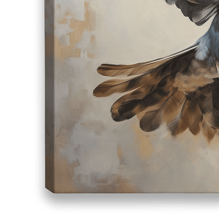 Taube in Bewegung - Auf der Leinwand sehen wir eine wunderschön wiedergegebene Taube im Flug, wobei besonderes Augenmerk auf die detaillierte Zeichnung und das Spiel von Licht und Schatten gelegt wird, das die Illusion der Bewegung verstärkt. Die Taube ist vor einem neutralen und sanft gefärbten Hintergrund dargestellt, der nicht…