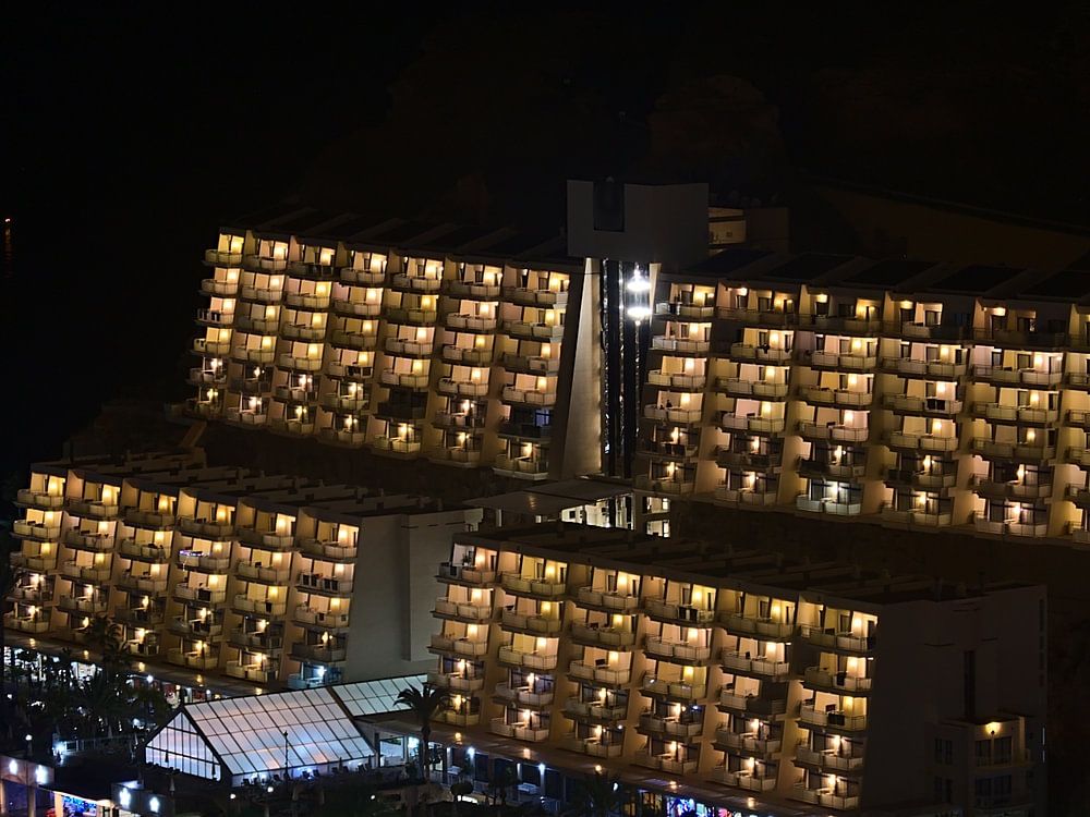 Ansicht des kleines Feriendorfes Taurito an der südlichen Küste der Insel Gran Canaria, Kanarische Inseln, Spanien bei Nacht mit einem beleuchteten Hotel am Hang.
