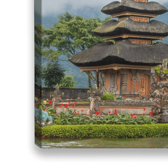 Tempel auf der Insel Bali in Indonesien. Architektur im hinduistischen Stil. An einem See mit Bergen an einem bewölkten Tag .