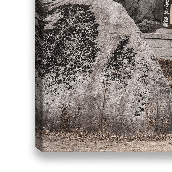 Tempel zwischen Felsen und Bäumen während des Winters in Südkorea. Das Foto wurde im Bukhansan-Nationalpark in der Nähe von Seoul aufgenommen.