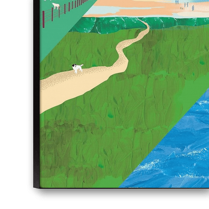 Die wunderschöne Watteninsel Texel, dargestellt in einem modernen Illustrationsstil mit einer Mischung aus analogen und digitalen Techniken. Abgebildet sind: die weiße Kirche von Den Burg und der Leuchtturm mit dem schönen Strand. Natürlich gibt es auch Schafe auf der Wiese.