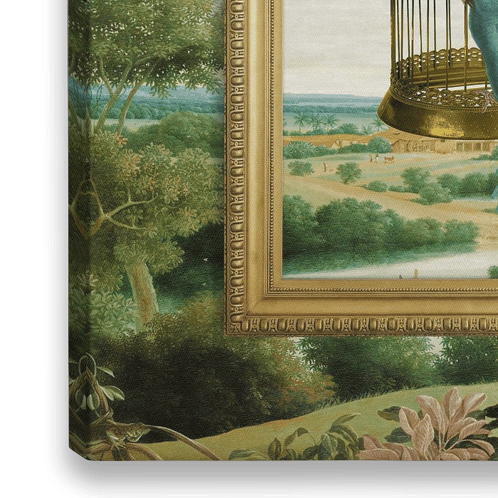 Eine digital hergestellte Komposition aus verschiedenen Bildern, darunter ein goldener Rahmen, 1 goldener Vogelkäfig, zwei Papageien und als Hintergrund das Gemälde "Landschaft in Brasilien", das 1652 von dem niederländischen Maler Frans Jansz gemalt wurde. Posten.