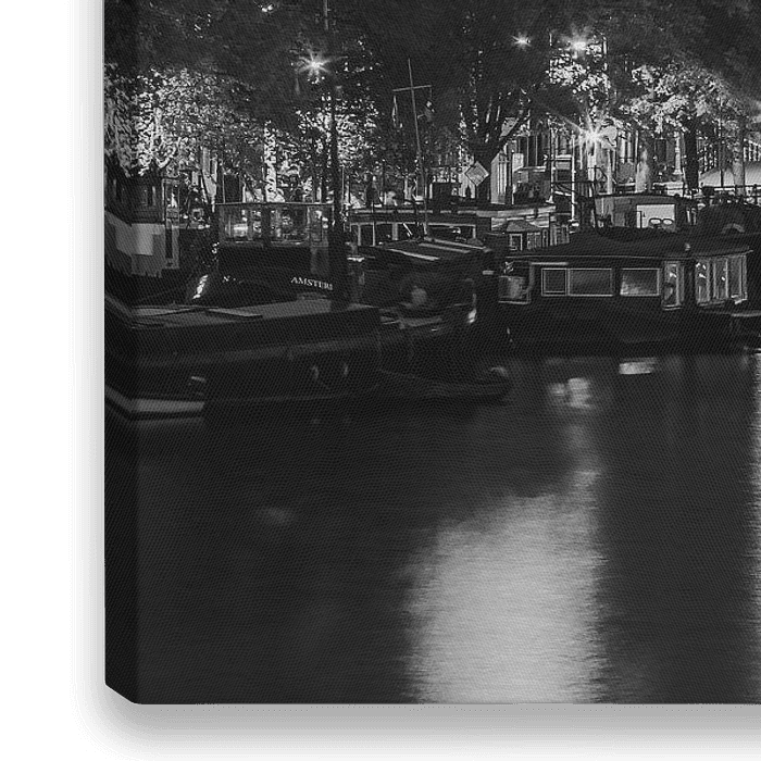 Ein Schwarz-Weiß-Foto eines Abends während der blauen Stunde in Amsterdam mit Theater Carre und der Skinny Bridge mit Blick auf den Fluss Amstel.