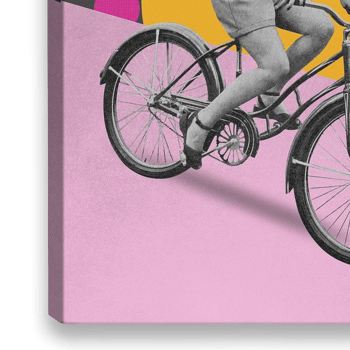Eine wunderbar fröhliche, farbenfrohe Retro-Szene: eine Frau auf ihrem Fahrrad.